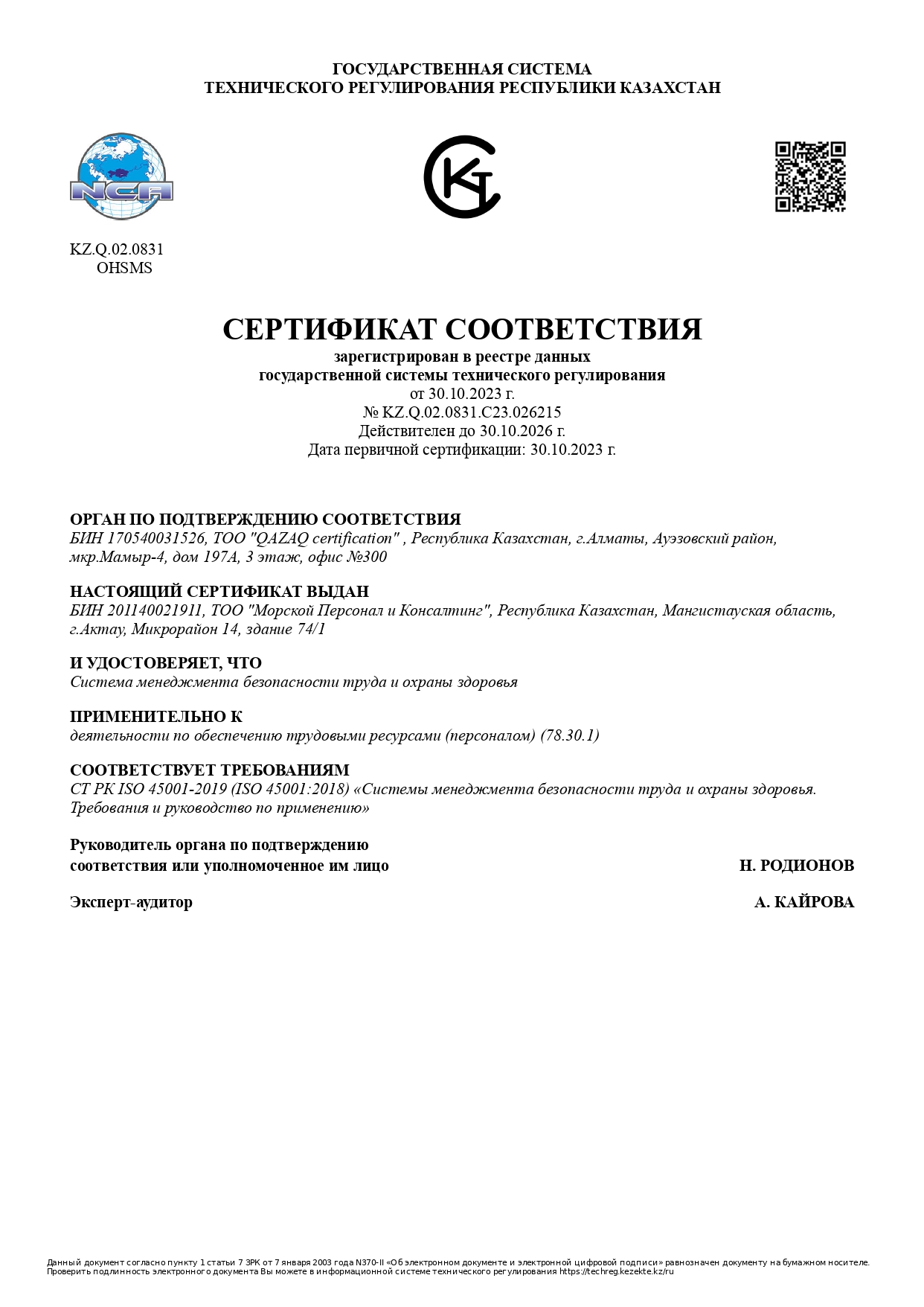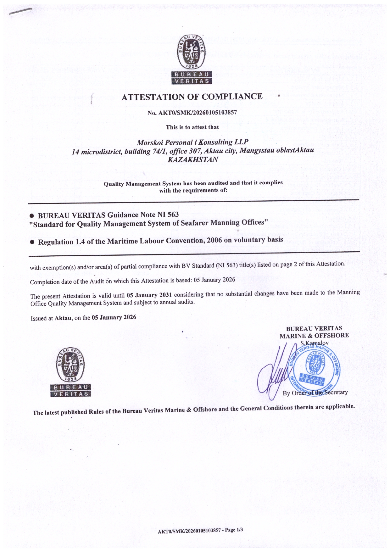 ТОО «Морской Персонал и Консалтинг» – лидирующая морская крюинговая компания, которая с 2020 года занимается подбором экипажей, проверкой их навыков, оформлением документов и другими аспектами деятельности по обеспечению морских судов необходимым для плавания персоналом.