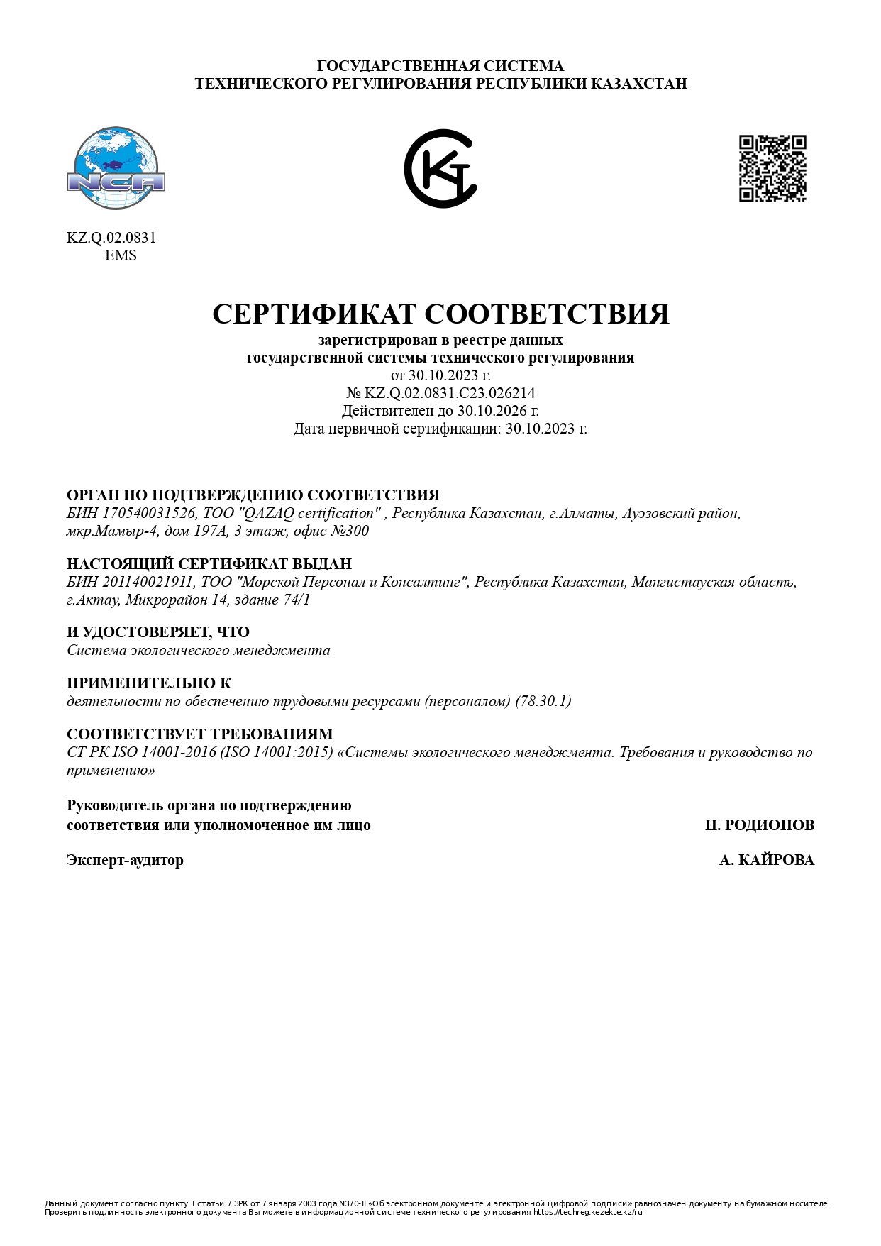 Компания сертифицирована в соответствии с требованиями СТ РК ISO-9001-2016, СТ РК ISO-14001-2016, СТ РК ISO-45001-2019. Компания прошла добровольное освидетельствование и соответствует требованиям стандарта А 1.4 Конвенции 2006 года «О труде в морском судоходстве» (MLC-2006). Компания является членом НОЮЛ «Ассоциация предпринимателей морского транспорта».